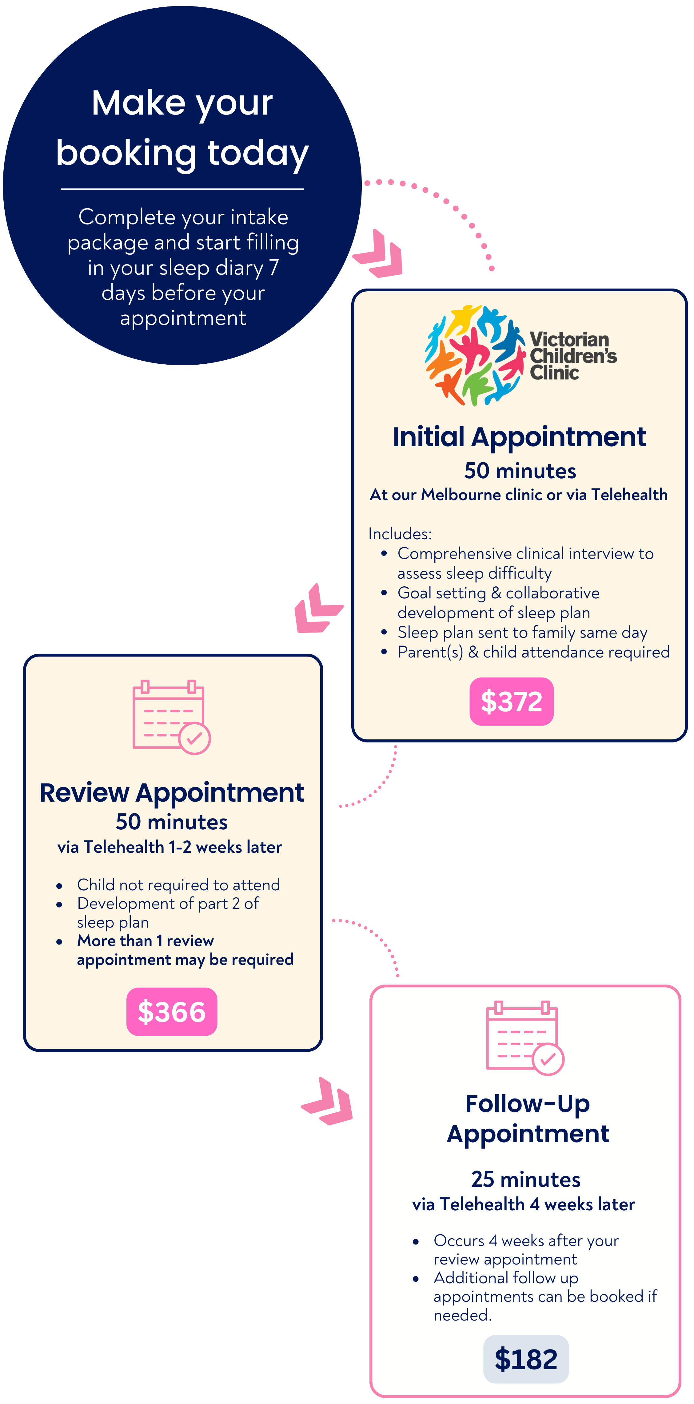To ensure your child’s sleep progress is maintained, we will also see you for a follow-up appointment approximately 4 weeks after your review appointment.